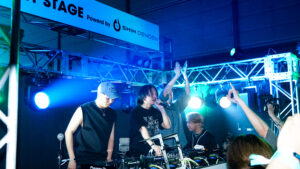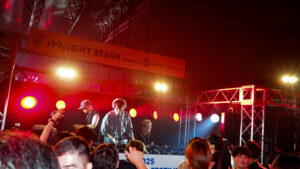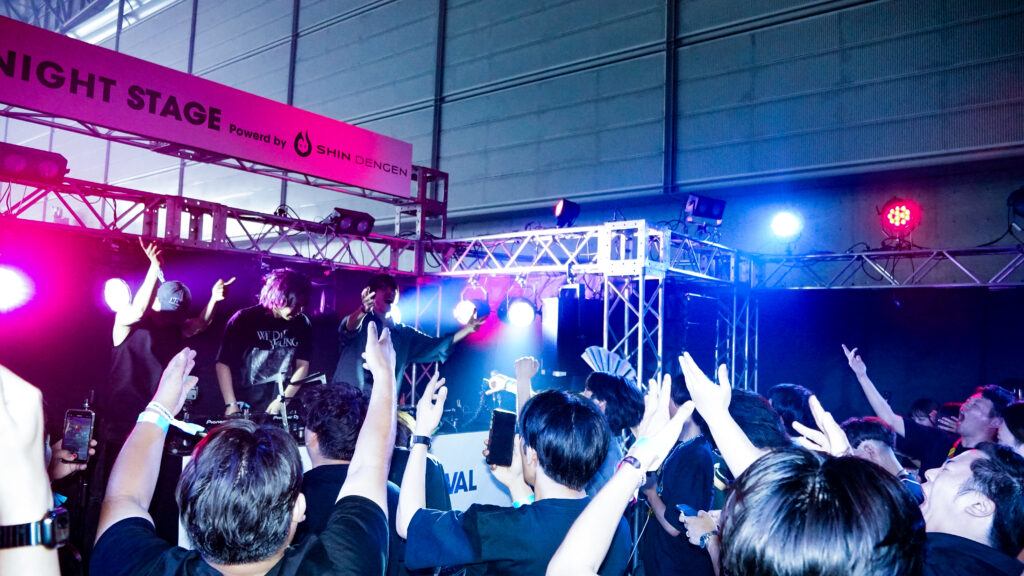 押し合いへし合いの波がうねる中、一部では船漕ぎモッシュまで巻き起こり、特設ステージは完全に戦場と化した。